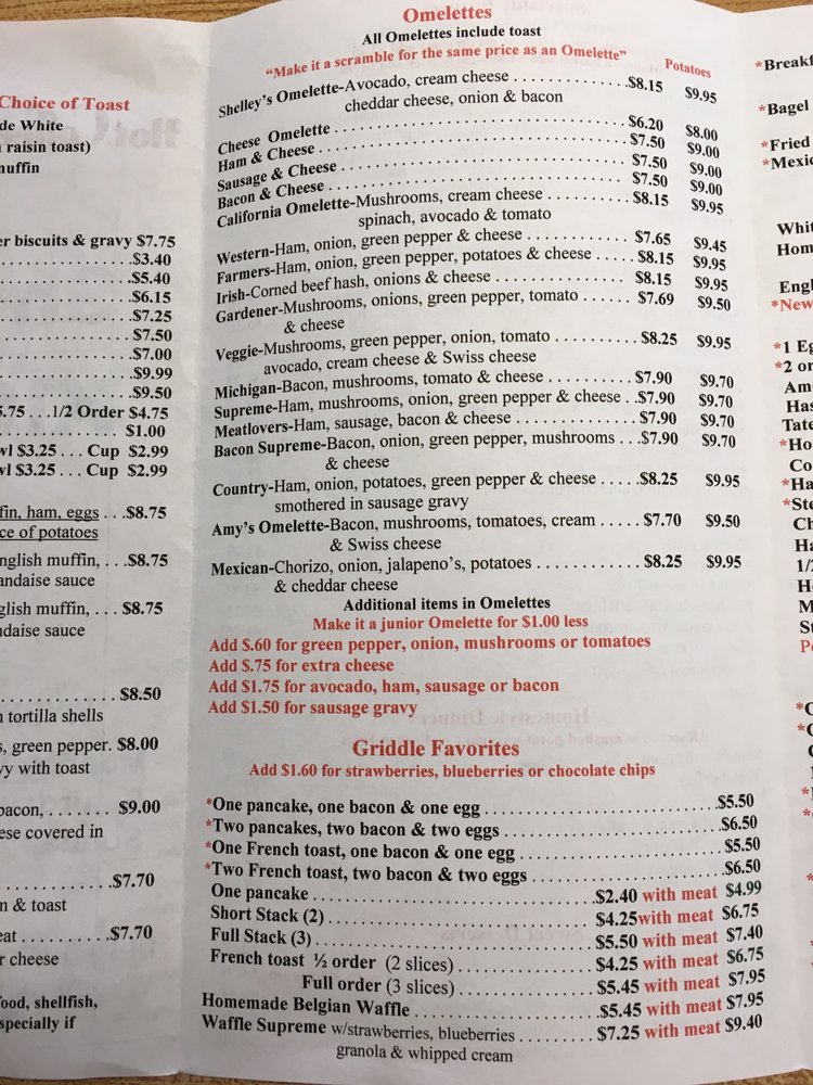 Customers rave about the savory Hot Beef Sandwich covered in rich gravy and creamy mashed potatoes. The Shelley's Omelette, with a perfect avocado and cream cheese ratio, is a must-try, according to loyal patrons. The chocolate chip pancakes are described as homemade, fluffy, and delicious, making them a popular choice for breakfast.